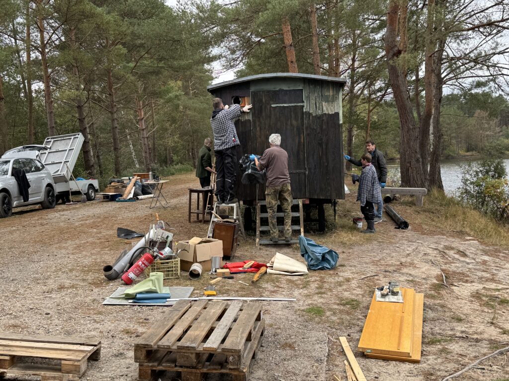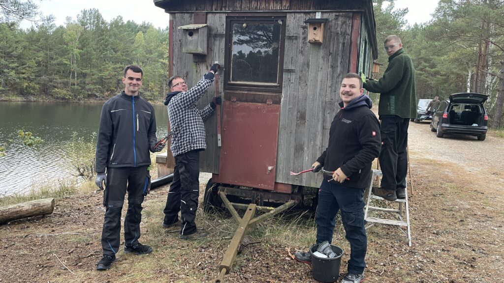 Da die Gruppe so klein war, haben sich schließlich alle Teilnehmenden um die Sanierung des Bauwagens gekümmert. Der Bauwagen wurde komplett entrümpelt, der verbrannte Fußboden entfernt, die Außenbretter abgeschliffen und anschließend neu gestrichen. Mit Hilfe eines Stromgenerators konnten auch größere Maschinen wie Bandschleifer und Schwingschleifer eingesetzt werden. Alle wussten, was zu tun war, und packten tatkräftig mit an. Dadurch herrschte ein tolles Arbeitsklima, und die Zusammenarbeit machte richtig Spaß. Während sich die meisten Helfer um den Anstrich kümmerten, sorgte die neue Jugendleitung für den Zuschnitt und die Montage der neuen Sitzmöglichkeiten aus Paletten. Gegen 15:00 Uhr war der gesamte Damm aufgeräumt, und wir beendeten den Arbeitseinsatz. Leider konnten wir nicht alles fertigstellen, daher wird es im Frühjahr 2026 einen Fortsetzungstermin geben in der Hoffnung auf eine größere Beteiligung der Jugendlichen.
